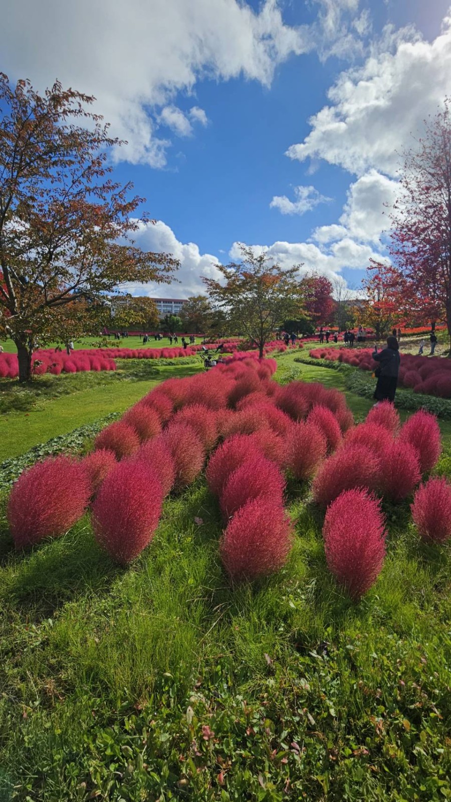 秋の澄んだ空気の中、赤やオレンジに色づいた木々、そしてピンク色のコキアがまるで絨毯のように広がっていました。
