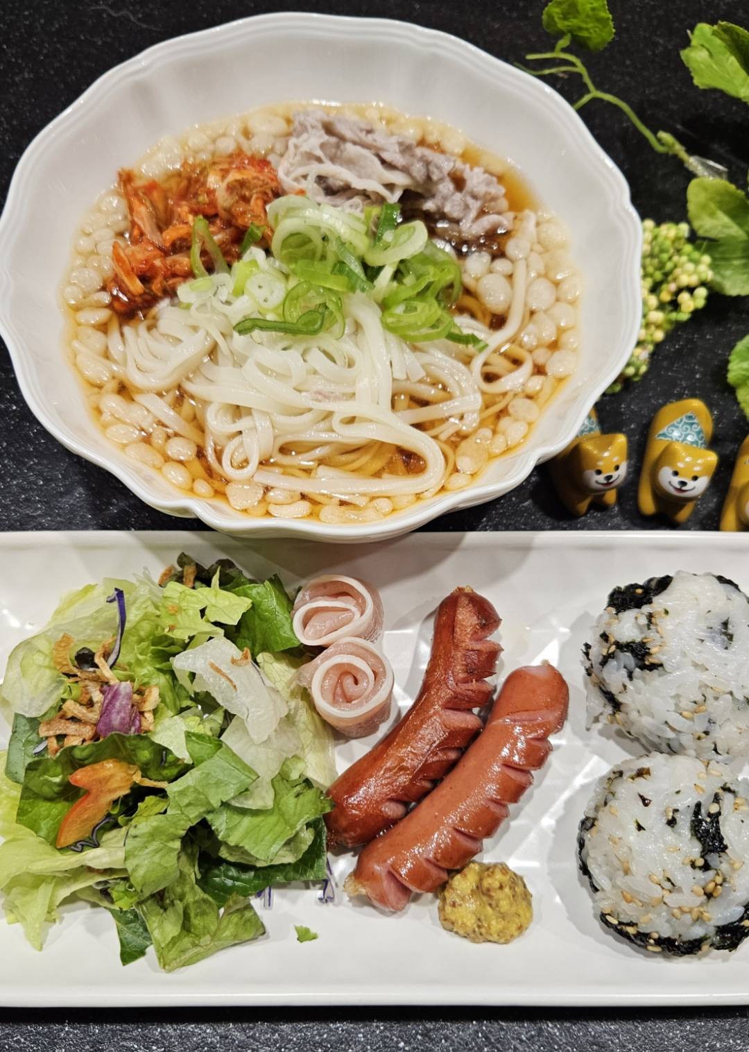 うどんだけでは少し寂しいので、プレートには韓国海苔ごまおにぎりと、カリッと焼いたウインナー、生ハムロール、それにシャキシャキのサラダも添えて。