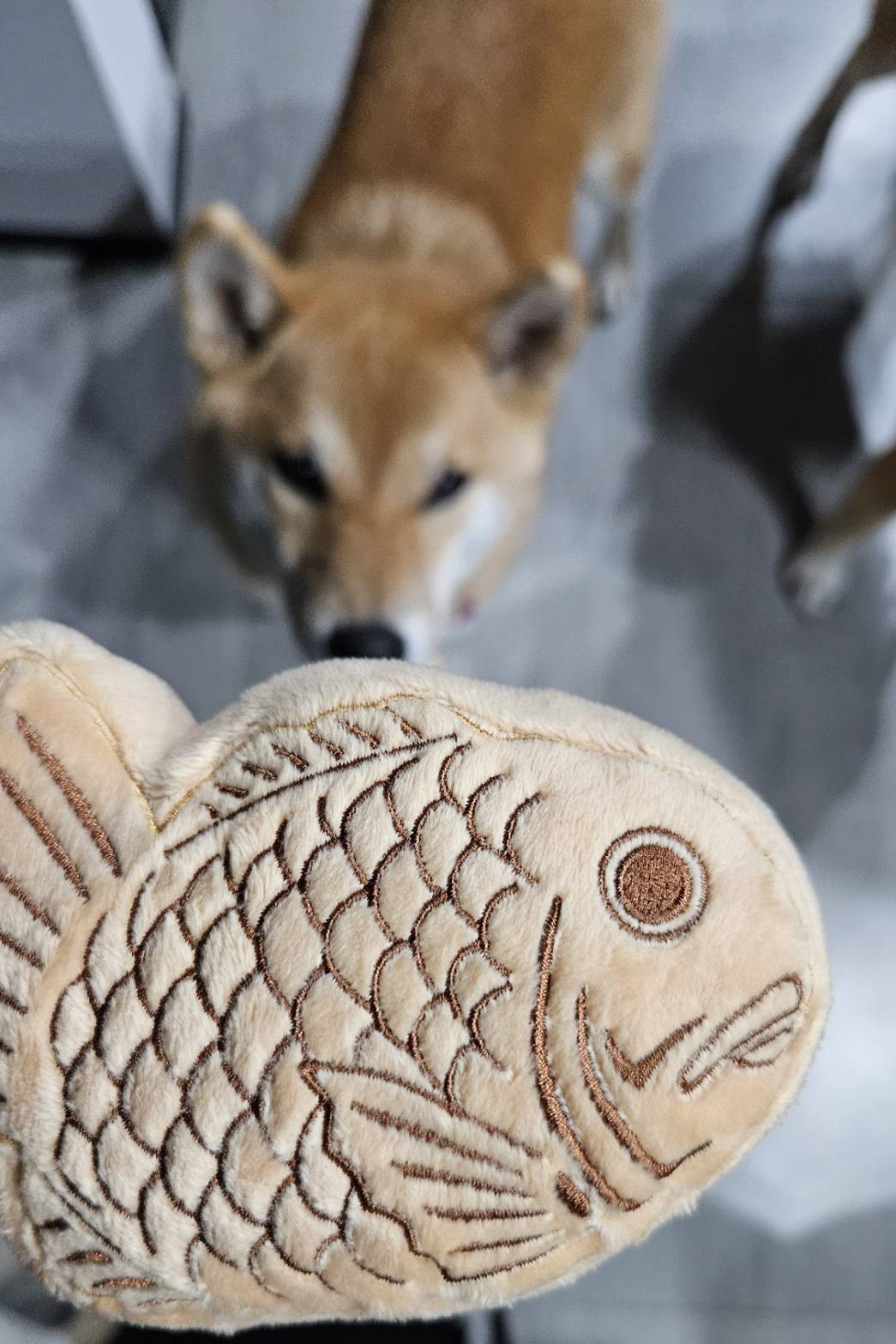 袋を開ける前から虎夏は興味津々で、たい焼きのおもちゃをじっと見つめていました。ふかふかの生地で触り心地もよく、咥えてピーピー鳴らすたびに楽しそうな表情。おもちゃが大好きな虎夏です。