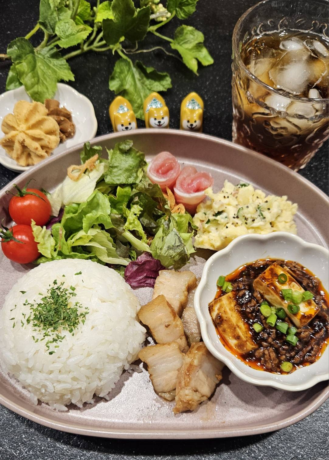 メインはピリ辛の黒麻婆豆腐。ひき肉と豆腐の旨味がしっかりと感じられるご飯がすすむ味です。サブには豚バラのチャーシュー、ポテトサラダ、生ハムと彩り野菜のサラダを添えてバランスよく。トマトの赤とグリーンのレタスで見た目も華やかに!