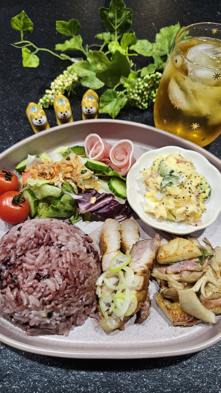 ご飯は黒米です。黒米には、老化防止の【アントシアニン】が豊富で、美肌やエイジングケア・目の健康維持に効果があります。また、食物繊維やビタミン・ミネラルも豊富で、血糖値の上昇を抑えたり、便秘改善、疲労回復、肝機能の改善といった効果も期待できます。