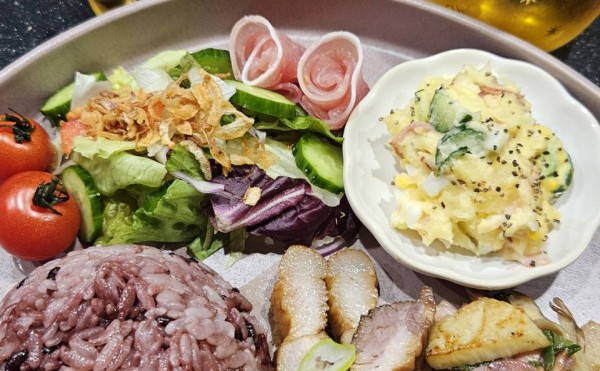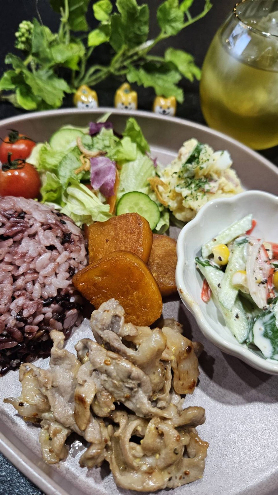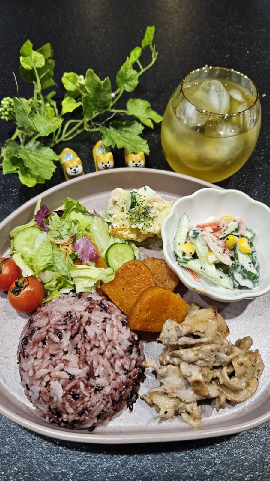 プレートには、黒米、豚肉マスタード炒め、ポテトサラダ、カニカマときゅうりのマヨ和え、そしてフレッシュな生野菜サラダも添えて。