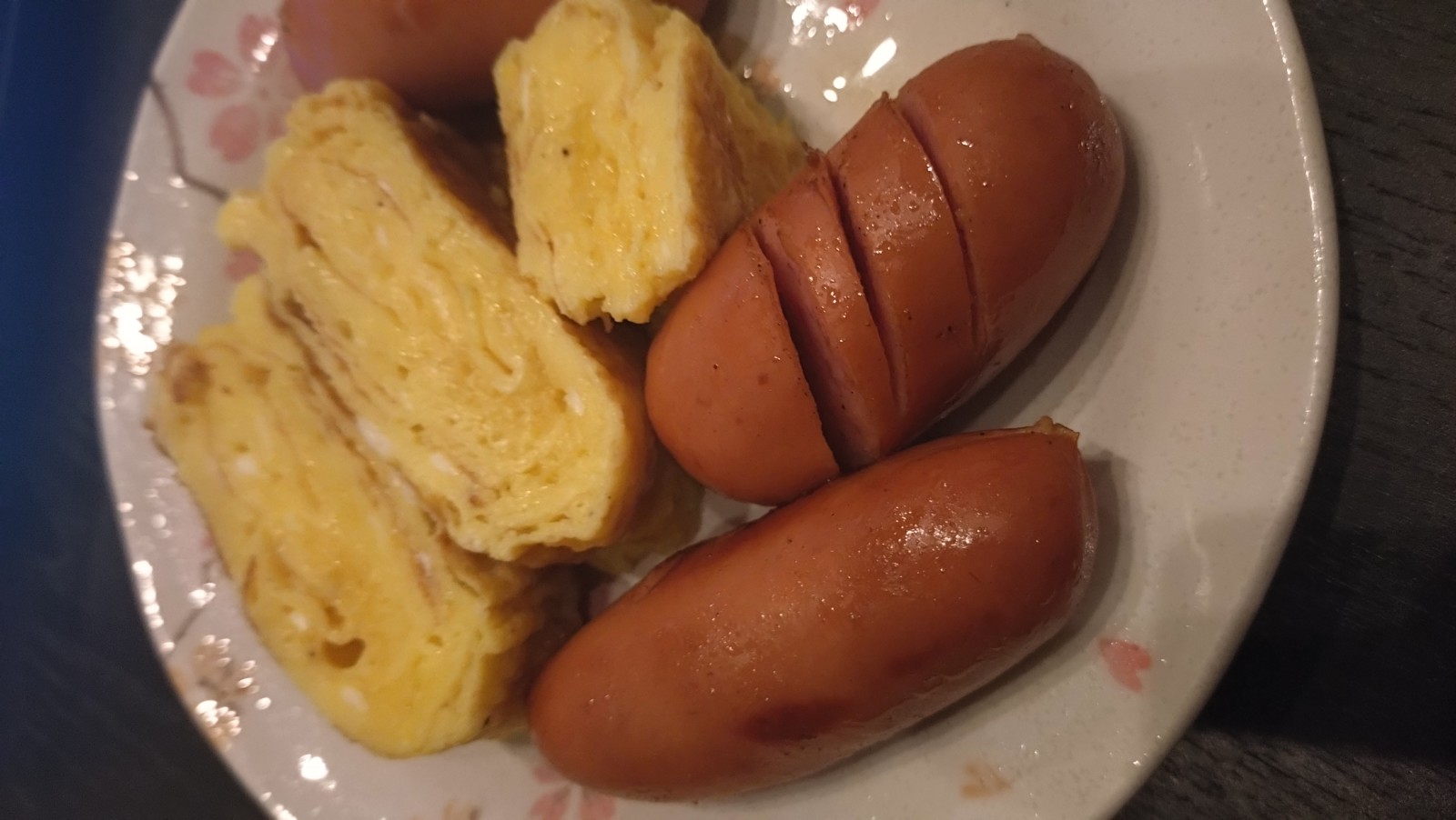 これは日本の食事でよく見られる、卵焼き(またはだし巻き卵)とウィンナーソーセージの組み合わせだと思います。