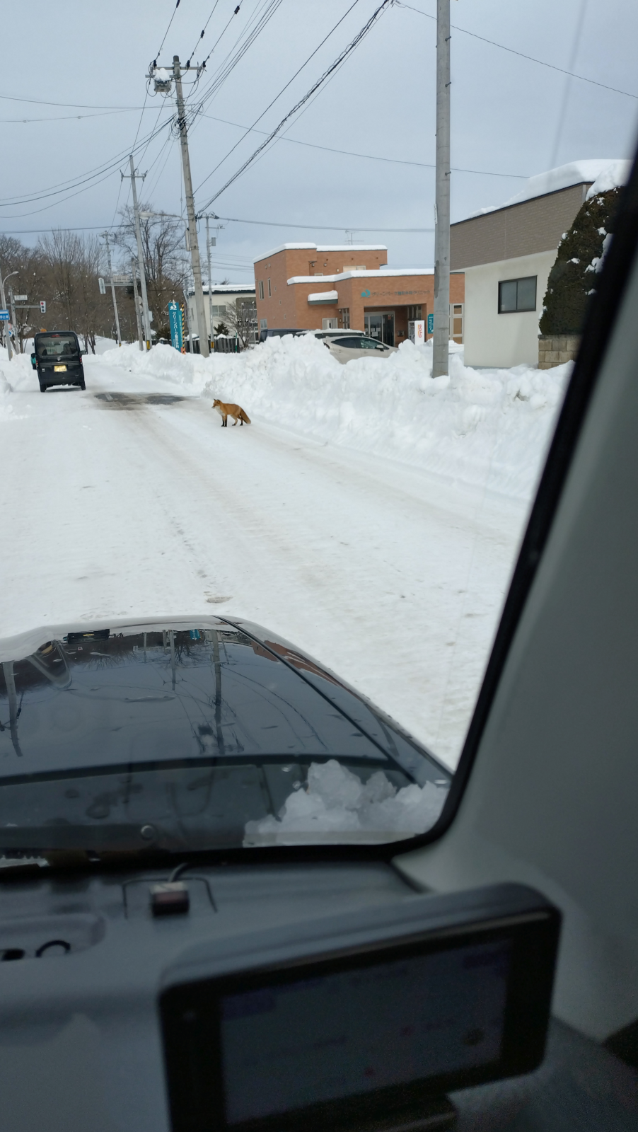 写真は、本日お客様の所へ向かう途中、キツネが迷子になっていた様子です。