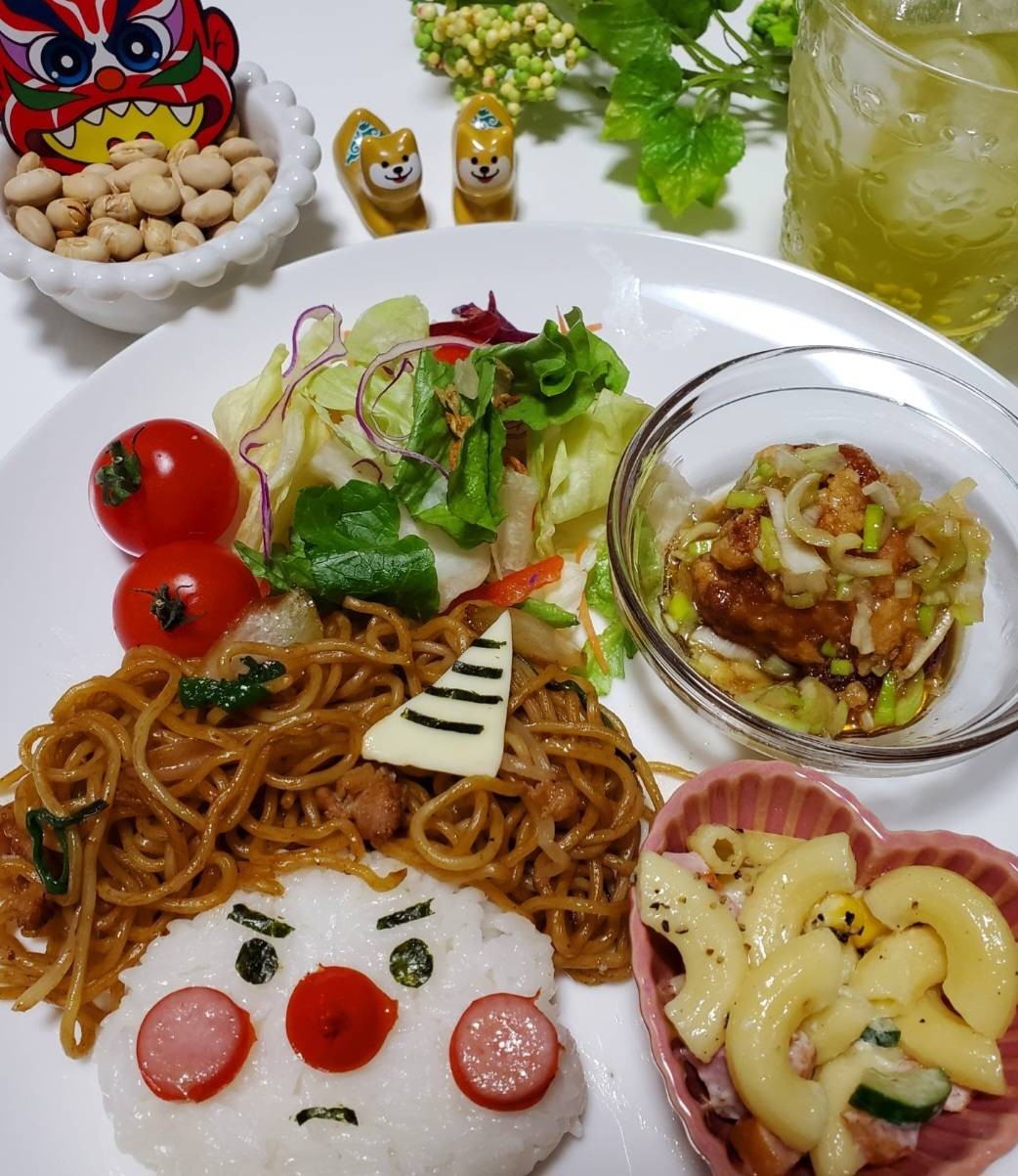 チーズで作ったツノを乗せて、お顔はご飯と海苔とソーセージで。 これなら子供も(大人も?)楽しく食べられますよね。 油淋鶏やマカロニサラダも添えて、ボリューム満点の鬼さんプレートでした!