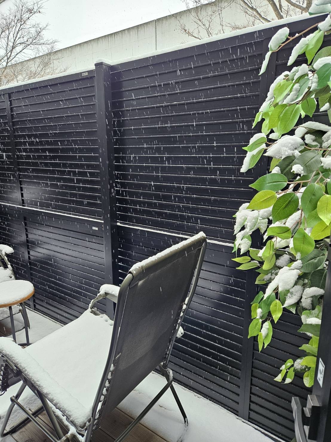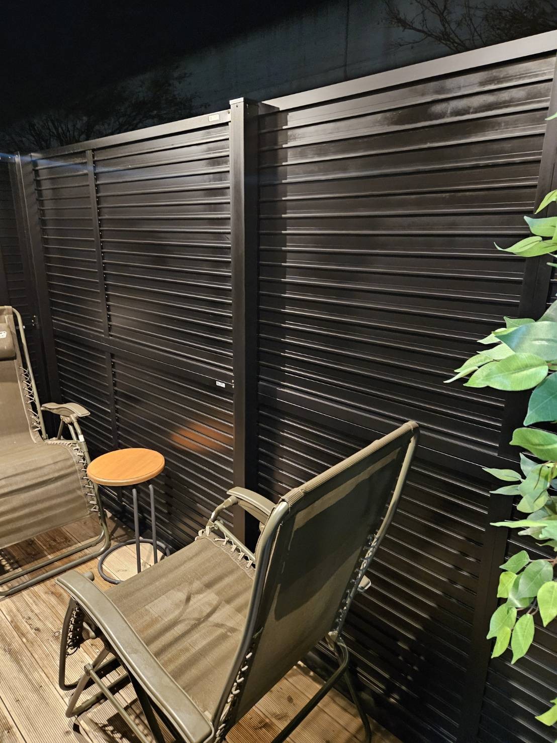 黒の目隠しフェンスでプライバシーをしっかり守りつつ、開放感のあるウッドデッキに、リラックス効果抜群のインフィニティチェアを設置。誰にも邪魔されない、自分だけの特等席です。季節ごとの楽しみ方もできます。