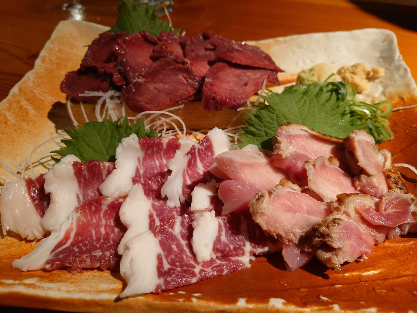 肉差し盛り合わせ。馬刺しと鳥刺し食べました