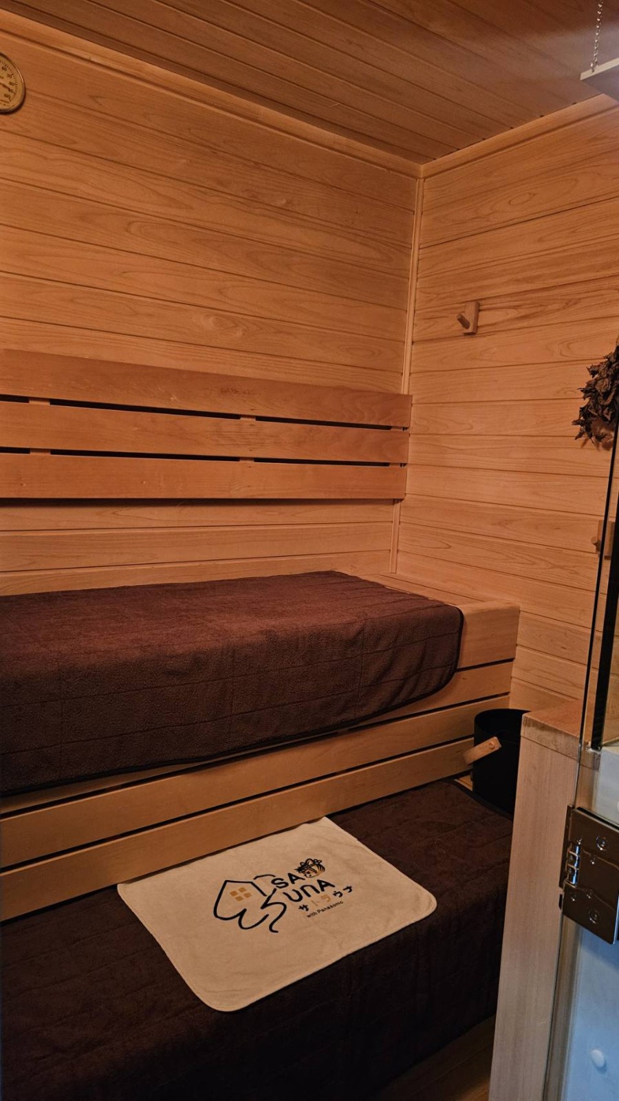 電源も入れ、サウナ室の中もバッチリ仕上がってきています。「サトラウナ」のロゴ入りマットも敷いて、準備万端です。木の香りが漂ってきそうで、スタッフも思わず入りたくなってしまいます。