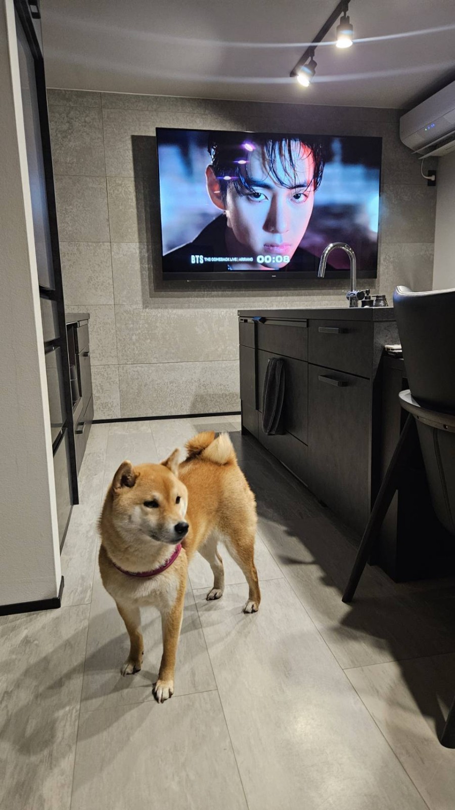 写真はキッチンからのワンカットです。シックな壁材に合わせた壁掛けテレビの大画面と、スポットライトの照明効果もあって、お家にながらちょっとしたライブ会場のような気分を味わえました。こだわりのキッチン空間で、好きな映像や音楽を楽しみながら過ごす週末は最高のリフレッシュになりますね。